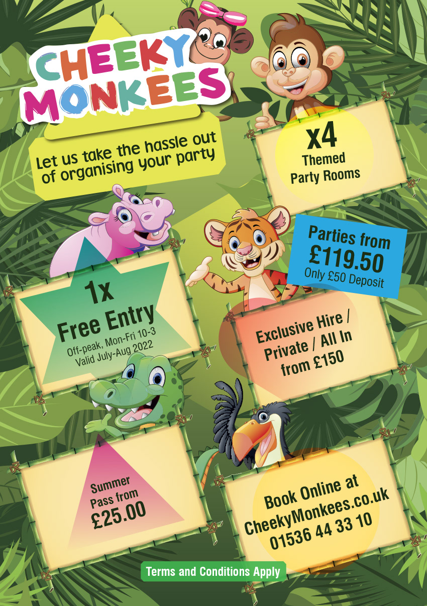 Children's fun rooms, event hire advertising. Honouring supplied branding (logo and 1 monkey) with a fun and adventurous theme.